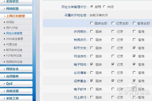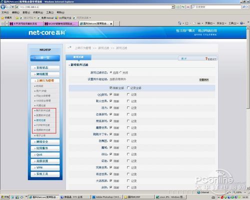 接下来是磊科NR285P的上网行为管理功能,它可以对视频、P2P下载、聊天软件、一些影响工作的像“偷菜”、“股票证卷”网站进行屏蔽。