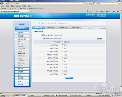 磊科NR285P可以禁止QQ,MSN等聊天软件的使用