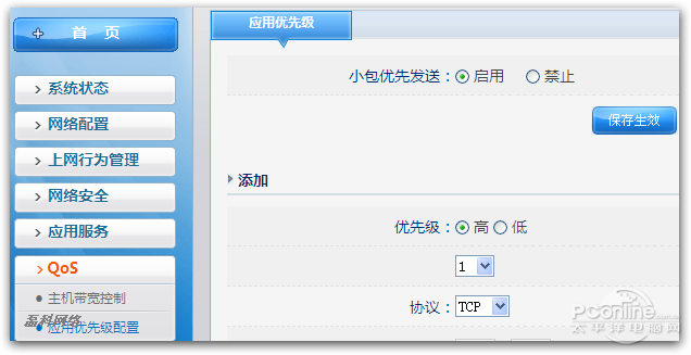 打开磊科NR285P的小包优先转发功能后我们再看看,进入路由器界面,选择QOS-应用优先级配置-打开小包优先发送。