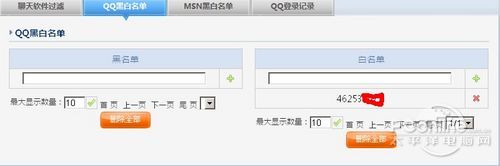 磊科NR285P的QQ、MSN黑白名单功能非常实用,可以适当允许部分QQ和MSN号码登陆,我们知道有很多机构的市场部或技术服务部都要与外界联系,而QQ又是国内最常用的通讯软件,所有工作时间许可一部分工作QQ上线是有必要的。