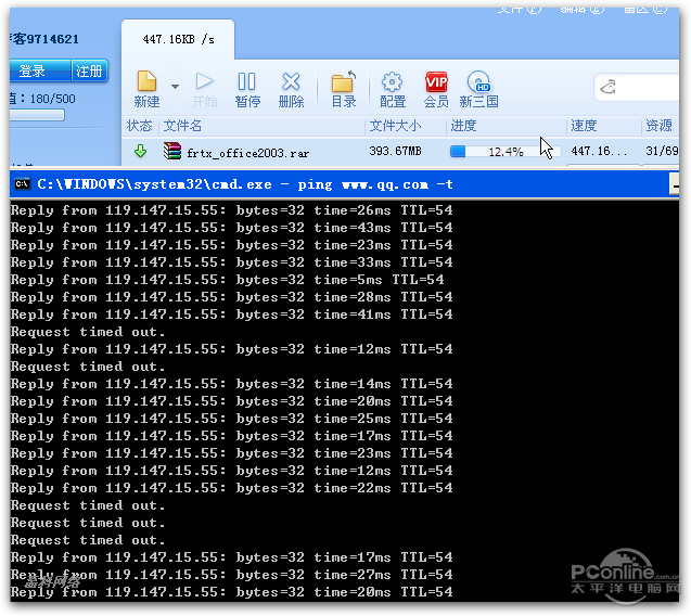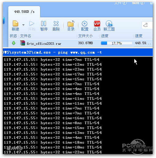 带宽500K,开启迅雷满速下载,同时ping外网,丢包,延迟非常大。
