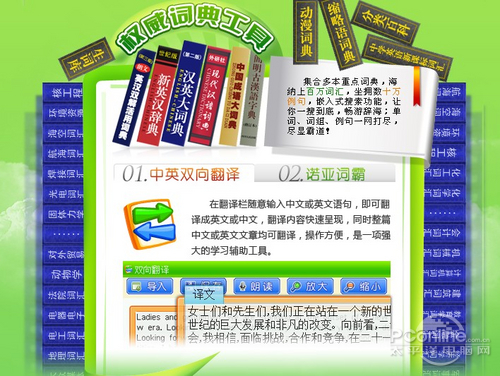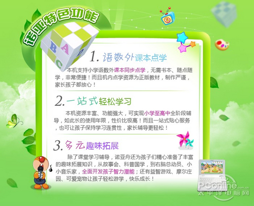 英语学习—三大方法背单词 看图识词:将生活息息相关的形象图片与单词识别结合,坦克大战游学测试巩固练习,生动形象,立体直观,激发孩子兴趣,系统学习模式培养孩子发散型思维;单词运动会:学习电脑NP5800特创趣味方法背单词,通过举重、拔河、马拉松运动项目训练孩子的单词听力、认知、拼写能力,将单词记忆融于游戏之中,轻松有趣,单词记忆更高效;口袋英语:通过学习(learning)、练习(training)和测试(test)三个环节进行单词的系统学习,听、写、练、记完美结合,全面提高英语应试水平;除了重点攻克单词难关以外,本机还有精品同步课件、名校考堂让学生轻松学练,更有英语文化礼仪知识,帮助学子更深入的了解英语。