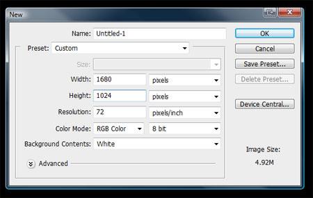 打开PS然后创建一个空白文档。我比较喜欢在一个大一点宽屏文档上面开始制作。切记使用RGB色彩模式以及设置为72DPI就好,因为我们紧紧是在屏幕上使用(注,一般印刷是300dpi,而屏幕只要72就够了,CMYK为印刷色)