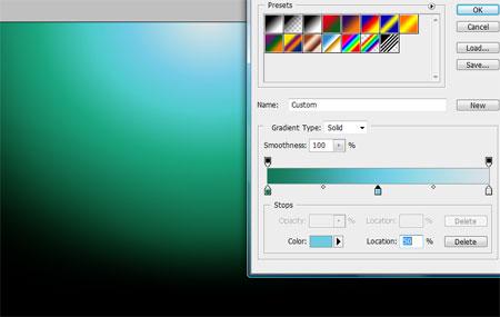 首先我们来处理页面的背景,这个地方没什么特别有趣的填充物。给背景选择一个素色,然后从上面使用放射性渐变工具一直拖到中间。当然你也可以选用自己喜欢的颜色,在这里我就选择了我选择的是蓝绿色的渐变。