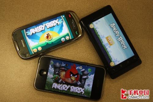图二:笔者将愤怒的小鸟分别安装在诺基亚C7-00、摩托罗拉Milestone(里程碑)、iPhone上,分别 为主流的Symbian系统、Android系统和iOS系统。其中版本分别是Symbian 3 Angry Birds V1.2.0测试版、Android Angry Birds V1.35完整版、iPhone Angry Birds V1.44版。