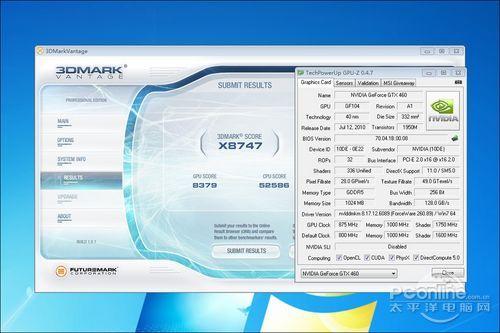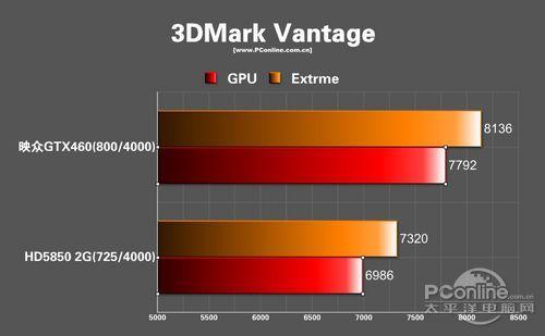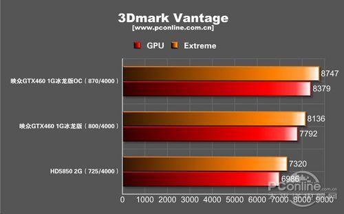 我们在默认电压与不改变散热设计的条件下,将映众460的核心频率拉到870,显存频率不成功跑完3Dmark Vantage的Extrme模式,与高端的10000分相去不远了。