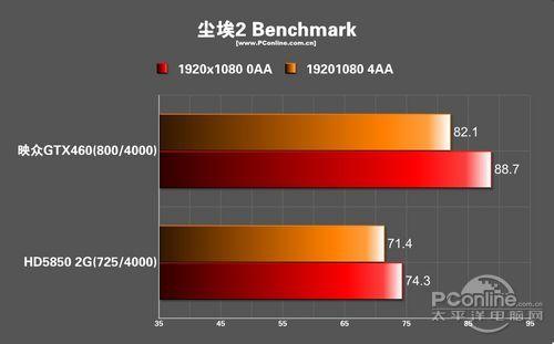 虽说《尘埃2》是为AMD显卡而优化的,但是映众460明显以10多帧的差距大大优于HD5850。喜欢这款赛车游戏的朋友还是选择460吧,因为流畅的游戏画面才是赛车游戏乐趣的根本。