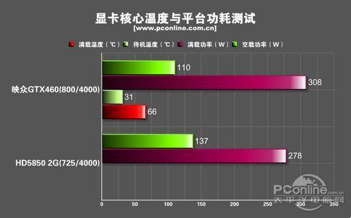 至于平台功耗方面,与往常DX11的A与N卡对比评测情况一样,HD5850的待机功率略高于映众460,而满载功率略低于AMD显卡。这得益于Nvidia显卡在非3D模式下,显卡的核心频率会降到一个相对较低的频率,这有利于待机功率的降低。