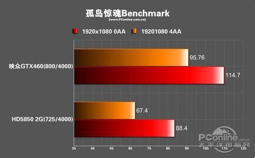 老DX10游戏《孤岛惊魂》已经对新一代的显卡不能造成任何压力了,在这个游戏的表现里,映众460大幅领先于HD5850。