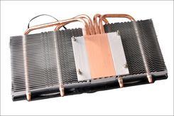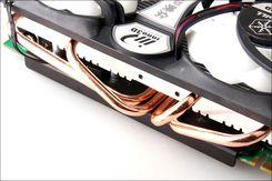散热器采用纯铜底接触显示芯片,再通过4条纯铜热管导向到并排的铝片上,最后使用两个大风扇垂直下吹进行散热,这是比较多中高端460采用的散热设计。