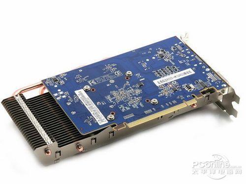 细看该卡背面,可以看到散热器的鳍片长度已经大大超出PCB长度,这样的设计提供了更有力的散热效能。对于HD5550的发热量,这款散热器已经能够在无风扇的情况下轻松压制,在使用环境中,这款产品不会发出任何噪音,能给用户带来极为完美的静音体验。