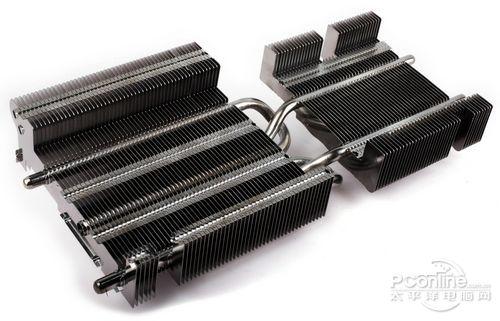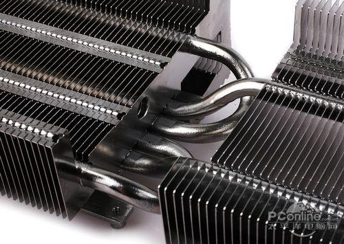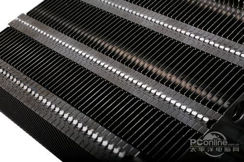 其次,再看热管排列方式,现在业界最为领先的方式是横穿式热管,它比竖串的方式,热管接触面积要增加34.2%。以往国内显卡实现横穿式热管的散热方案,只有一种选择,就是直接购买瑞士著名散热器厂商AC的方案。而今天在iGame GTX460上第一次依靠自主研发实现了这样的高效散热结构。