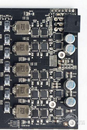 此外,整卡布满了Nippon(日本化工)固态电容,在供电部分使用了NCC 军工级POSCAP电容,温度控制与稳定性得到同步性的提高。5相供电每一相供电都配备两颗安森美的SO-8FL封装低内阻MOSFET(八爪鱼),拥有超低的内阻值。其典型内阻值有3.2mΩ,与目前市场上使用量最大的ST和ON的3脚MOS相比降幅达到60%以上。