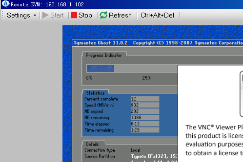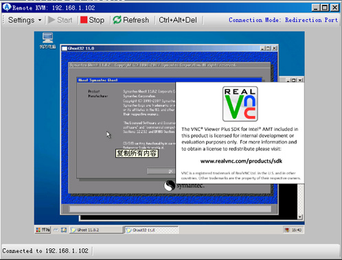 为了演示博锐平台强悍的远程管理功能,我们搭建了一个测试环境,PC1是一台基于博锐平台的台式机,PC2是控制端,仅是一台普通的PC。演示前需要完成两项准备工作:首先,将PC1当前系统进行备份,备份文件存放在D盘,还原时我们将用到这个镜像;其次,制作一个包含GHOST的可启动光盘镜像(制作方法有多种,不在这里赘述)或者直接使用WinPE类系统维护光盘镜像。接下来我们要做的就是使用这个镜像(ISO)远程启动PC1,并运行其上的GHOST完成系统还原。