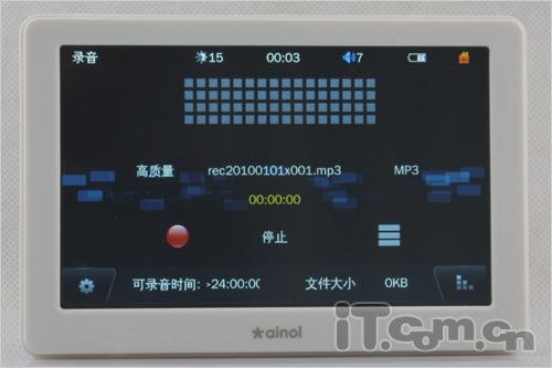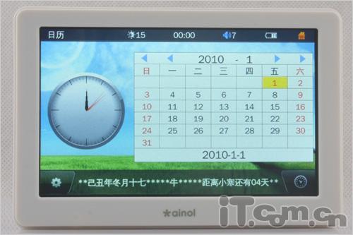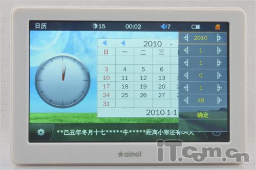 艾诺V5000HDG没有内置游戏,附加的还包括FM、MIC录音和万年历功能。其收音效果一般,室外搜索信号较好;录音模式保存为MP3格式,提供高中低三种质量可选;万年历除了年月日和星期之外,还有农历、24气节的提示。