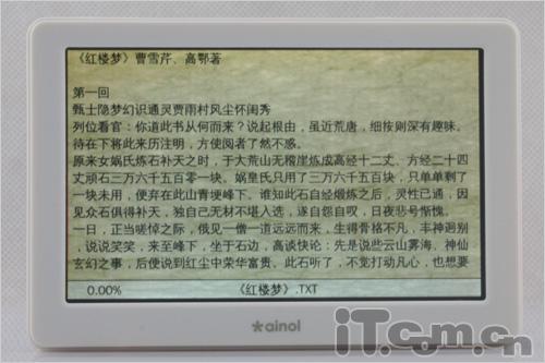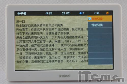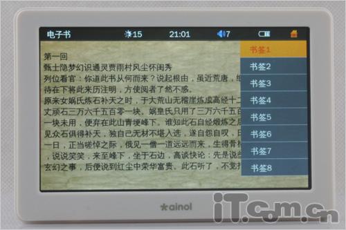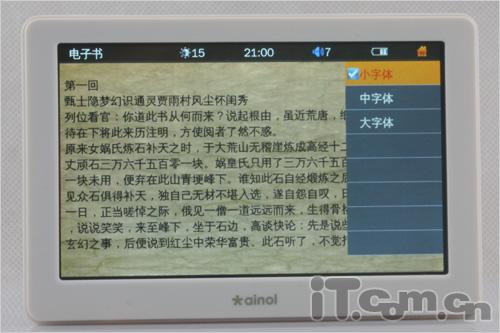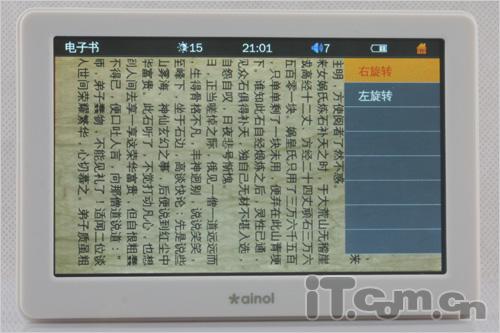 和艾诺其他机型一样,V5000HDG只是支持TXT文件阅读,羊皮纸质的背景,搭配雅黑字体,看上去十分舒服。电子书功能支持书签、字体大小、切换效果设置,还可以左右旋转,让MP4也能够实现近似于传统纸张书籍那样的阅读方式。
