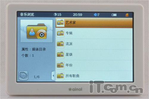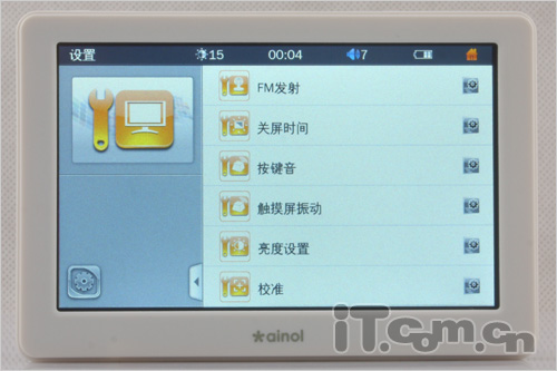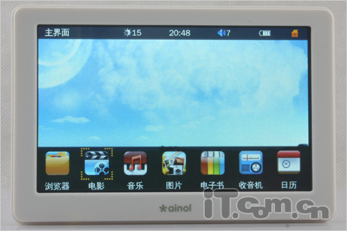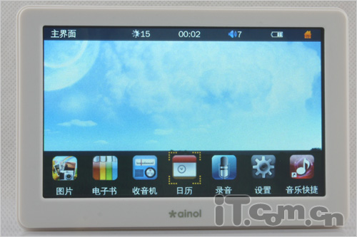 艾诺V5000HDG菜单的UI设计类似WIN 7的风格。有电影、音乐、图片、电子书、收音机、日历、设置、录音以及浏览器。另外,艾诺V5000HDG也保留了音乐快捷的按钮,在打造个人桌面方面,个人感觉高清MP4还是比智能MP4要差许多。