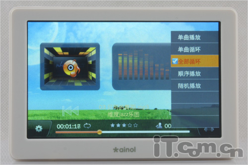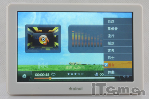 艾诺V5000HDG支持单曲、单曲循环、全部、顺序和随机播放,音效设定有自然、重低音、流行、古典、爵士之外,还有语言、舞曲模式,声音的输出方式更多元化,完全能满足一般听众的需求。