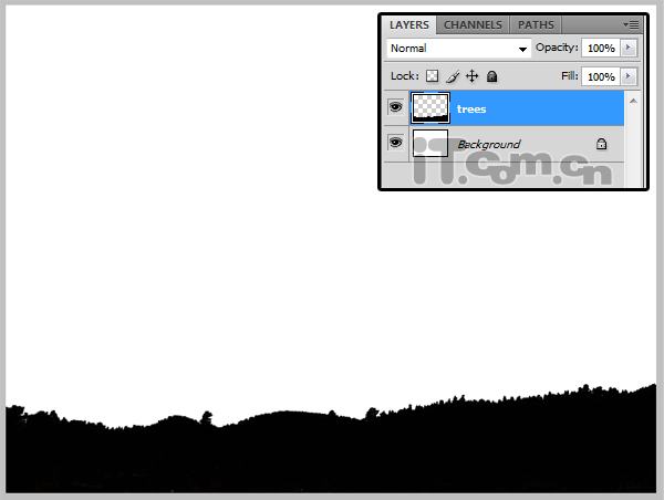 1、首先在photoshop中创建一个新图片,大小主要取决于你屏幕的分辨率,我选择了1024*786。使用打开一些晚上的风景照片把它粘贴到图片中命名为“树”,使用自由变换工具调整它的大小。使用魔棒工具选择黑色山坡,然后按下Ctrl+Shift+I反选,按下Delete键删除天空部分,如图所示。