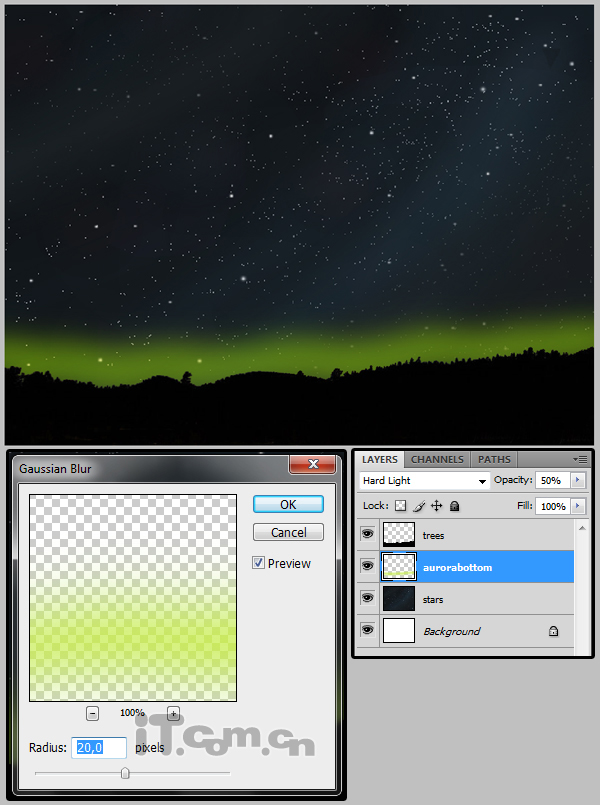 3、创建一个新图层移动到“树”和“星星”图层之间,然后设置前景色为#caee05,使用较大小柔角画笔在山坡与天空交界的位置涂抹出一条光带,然后执行“滤镜—模糊—高斯模糊”设置半径为20px,图层的混合模式为强光,不透明度为50%,如图所示。