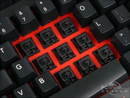 雷柏 V5采用Cherry黑轴,能够提供极快的按键反馈速度以及2mm的触发行程,对于游戏玩家来说,是非常犀利的游戏利器。在按键下方,也没有采用传统的黑色,而是红色,用户通过键帽之间的间隙也可以看到,可以带给人更加热情奔放、有激情的感觉。