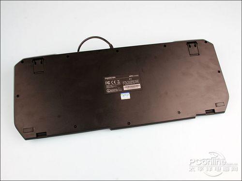 雷柏 V5键盘的背面可以看到,键盘上方提供了2个支撑脚,同时在下方提供了2个凹槽,这是用于和腕托相连接并固定的位置。