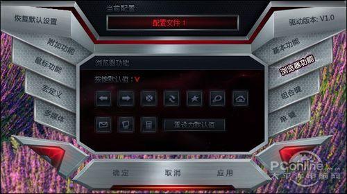 当我们在驱动界面点击一颗按键的时候,就会出现按键功能编辑界面,可以设定的功能包括:浏览器功能、组合键、单键、附加功能、鼠标功能、宏定义、多媒体几类。这些功能已经基本覆盖了所有的按键功能,这款键盘不仅在游戏方面功能强大,同时在多媒体播放、家庭使用方面也是功能强大。