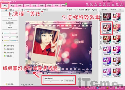 3、场景添加好后,图片艺术效果已经初步形成。为了使照片跟选择的场景素材更加融合,同时使照片更有艺术感,给照片添加一些特效。进入“美化”菜单下,根据喜好选择特效。当然,除了添加图片特效外还可以增加文字、饰品等,发挥自己的创意来装饰照片。
