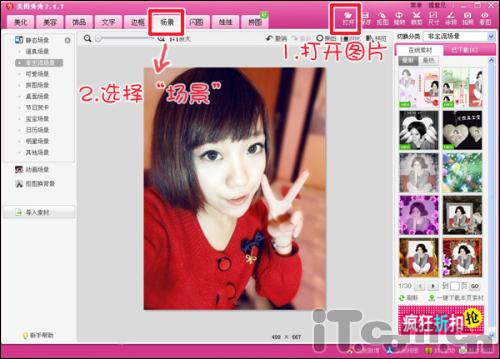 1、启动软件,打开要处理的图片。为了摆脱大头照千篇一律的模式,我们可以给单调的图片加个漂亮的场景,先进入“场景”菜单下。