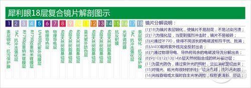 | 镜片抗辐射 | 犀利眼的抗辐射镜片经过特殊电导体薄膜处理,使镜片具有抗电磁辐射及吸收正电核能。使用者能免除因低频辐射造成眼睛潜在的发热导致其他病变发生几率及避免神经受到伤害。- |