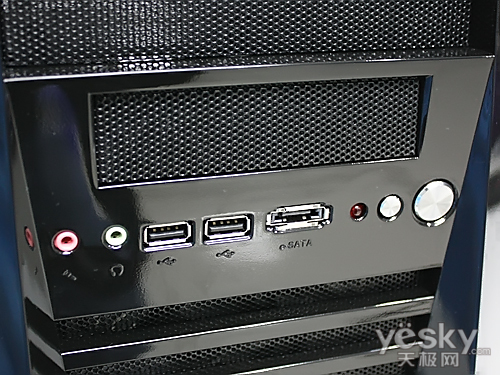 KM-9188的I/O模块部分放在了中间部分,拥有两个USB2.0接口与一个e-sata接口,音频麦克风接口和开机重启按钮,这种设计比较中规中矩,放置在机箱的中间还算方便。