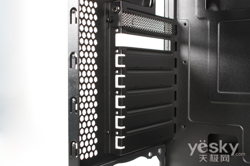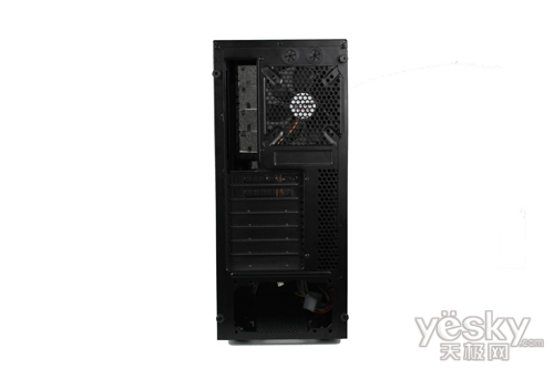 最后我们再看看机箱的背面板设计,KM-9188的背面板设计也比较精细,与现在市面大部分流行的游戏机箱相似都采取了电源下置的方案,同时上面的位置就配备一个120mm的大型散热风扇和两个水冷孔,而PCI挡板的位置则多达7个,其中两个可活动的挡板位置用了防尘网罩代替,这点比较贴心。