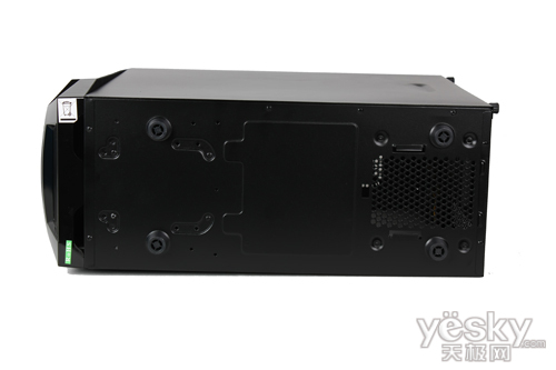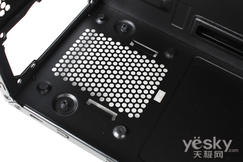 KM-9188的顶部和底部均设置有散热孔,顶部的散热孔能够安装12mm散热风扇,足够保障了散热性能。底部可以看到它是采用电源下置的方案,而且在承托电源的四个角有胶垫设有保护,既可以保护电源不与地板直接接触又可以为底部散热孔留下散热空间,这个细节位置值得关注。