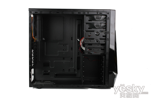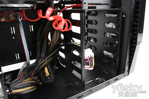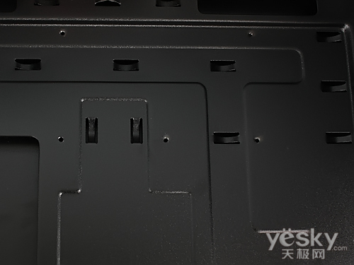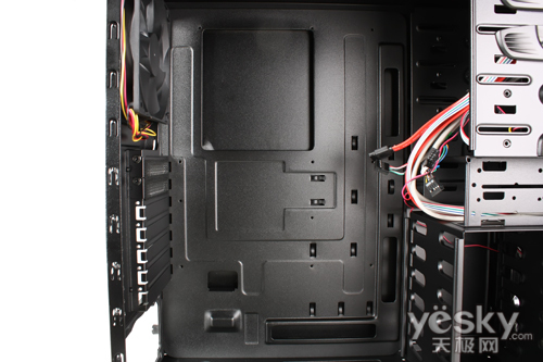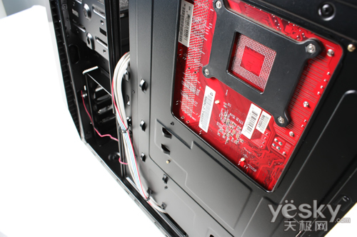 KM-9188的背板走线也是其特色之一,可以看到机箱的主板托板设计比较标准,拥有大量的束线扣和多达50%散热面积的散热孔,不过走线的空间不是十分足够,经过测量约为10mm的宽度,太粗的线材可能比较难进行背部走线。