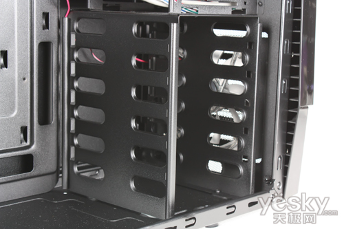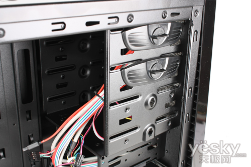KM-9188的提供了提供4个5.25英寸驱动位和5个3.5英寸硬盘位,全部均采用了免安装工具设计非常方便,硬盘架也是流行的镂空设计,便于机箱走线和硬盘散热。除了以上的标准扩展设计以外,KM9188还额外提供2个2.5英寸插槽位,可直接安装2.5寸SSD,从扩展性来说,KM-9188还是不错的。