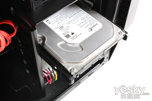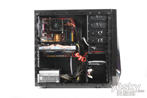 可以看到KM-9188的箱内空间还是比较充足的,连盈通GTX460极速版这种大块头都能够轻松的安装。方便的免工具设计让安装光驱硬盘非常简单,不过实际测试过程中,扣具的设计可能不够完善,硬盘有一定的松动。