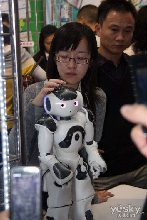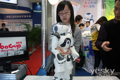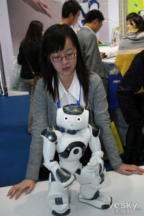 在现场无线电技术的展区一隅,有一位很认真负责的MM,貌似一个人在现场,展示着他们企业的机器人。该机器人能够感应控制者的动作并做出相应反应。