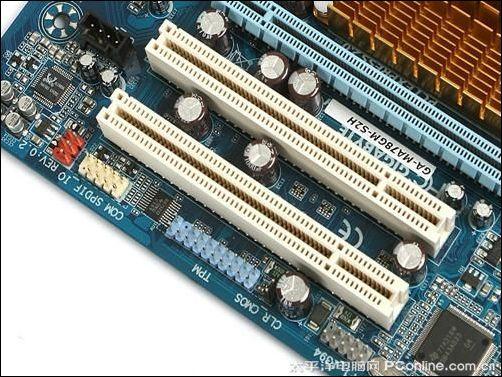 在扩展插槽方面,主板带有1个PCI Express x16插槽,可以和主板整合的HD 3200显示核心组建混合交火系统,此外,还提供了1个PCI Express x1插槽和2个PCI插槽。