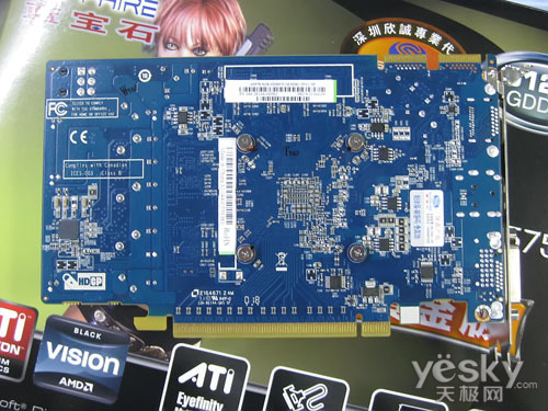 显存方面,铭瑄HD5750高清版II 512M显卡板载4颗hynix0.4ns GDDR5显存颗粒组成512M/128Bit的组合,默认核心显存频率为675/3600MHz。
