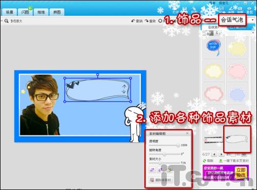 5、接着进入“饰品”菜单下,分别在“会话气泡”“卡通形象”和“缤纷节日”饰品分类中找一些饰品素材,并选中添加进图片中。饰品素材都是一键选中,添加后还可以适当调整位置大小!