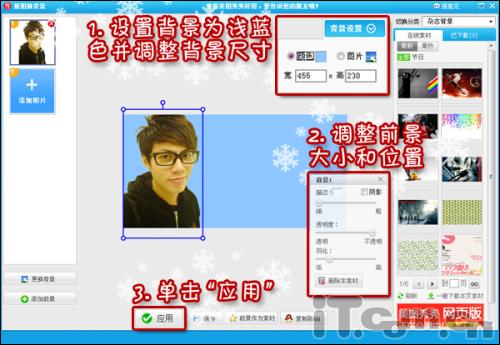 2、在弹出的“抠图换背景”编辑框中设置纯色背景图,颜色设置为浅蓝色,并修改背景大小为455×230。