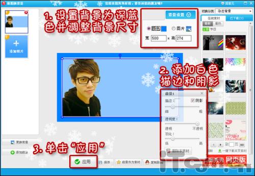 4、这次将抠图背景设置为深蓝色,大小设置为500×274像素。并在前景编辑框中添加前景描边和阴影,这样就轻松制作出边框效果。