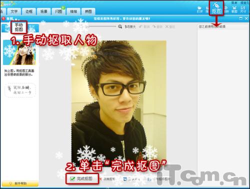 1、在“美图秀秀”软件中打开一张自己的照片。点击界面右上角“抠图”按钮,使用“手动抠图”将人物抠取出来。