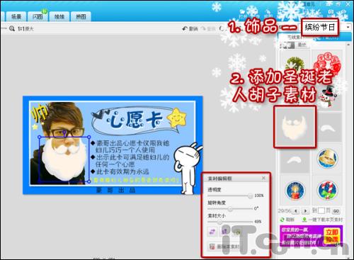 7、最后返回“饰品”菜单下,利用“缤纷节日”中的一些恶搞素材,给自己戴上可爱的圣诞老人胡子,装扮成圣诞老人送心愿,可是相当有创意哦!心愿卡这就完工啦。