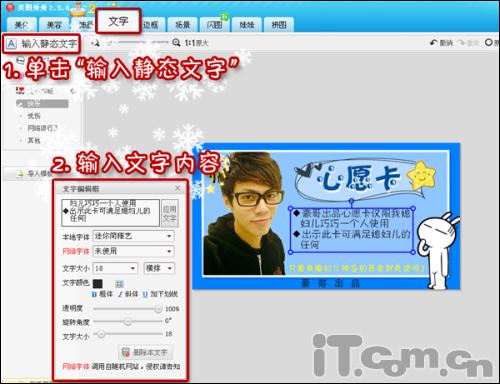6、再进入“文字”菜单下,利用“输入静态文字”功能,添加心愿卡的文字内容。