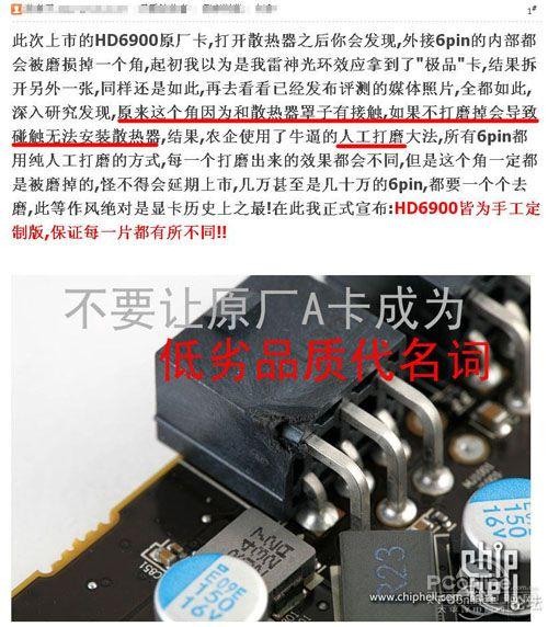 继续深入研究,这位站长发现,原来是因为AMD HD6900系列显卡的散热器和PCB板设计不匹配,散热器罩与PCB板上的外接6pin供电插头位置有冲突,如果不打磨掉一个角会导致碰触无法安装散热器。