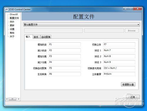 3D显示功能的快捷键设置。在这里用户可以自定义实现各种3D功能调试的快捷键。包括“减小分离”、“增大分离”等。具体效果在后文说明。
