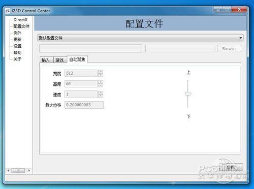 自动聚焦的程度,也就是远景到底“远”到什么距离,用户能够通过设置iZ3D的驱动控制面板中的“宽度”、“高度”决定。“上下”拉动条决定对焦的水平线的位置。“速度”则决定立体世界的移动快慢,“最大位移”决定了立体世界的左右摆动的幅度。这些数值调得越大,空间感越强,但运行速度越卡!