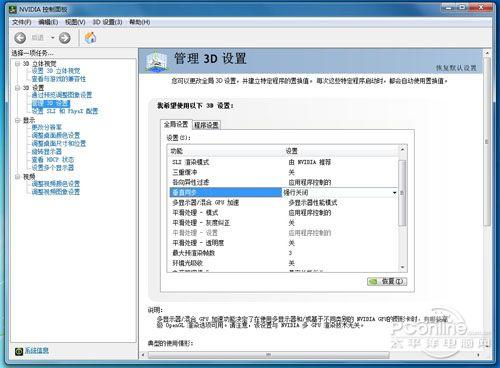 然后,我们进入Nvidia的驱动控制界面,选择“垂直同步”,选择“强行关闭”。根据3D成像原理,帧与帧之间是不同步的,如果游戏强行运行在“垂直同步”下,则可能对显示器造成永久损害,请注意!