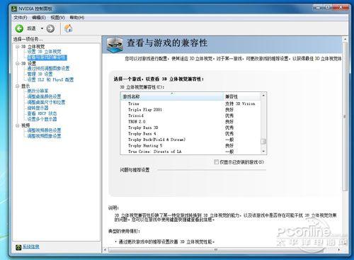 接下来,在同样的驱动控制面板中,查看各种游戏对3D显示的兼容,其兼容性由好至坏,分别为“支持3D vision”、“优秀”、“良好”、“一般”和“不推荐”。
